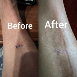 Following knee replacement surgery, I began applying this gel, and I am impressed by how small the scar has become. The first image is from the day I came home, and the second one is from 9 weeks later at Physical Therapy. I am so glad my doctor recommended this. I am now using it on many older scars.